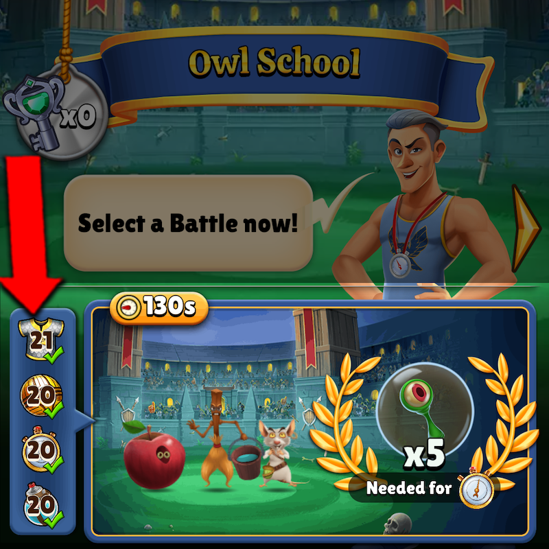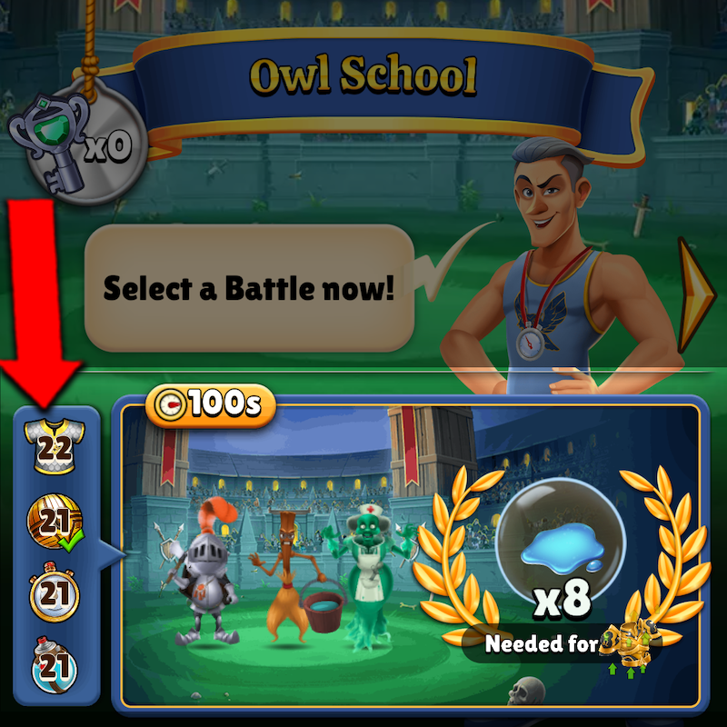 In the following battle, you’ll have less time to achieve victory, and your Chainmail, Wizard’s Watch, and Booster Drink Artifacts are below the Recommended Levels. This will make the battle more difficult. To use your Stadium Key efficiently, consider selecting an easier battle.
