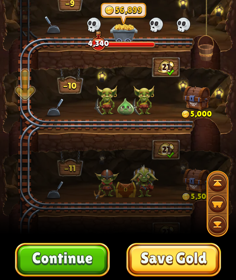 Just as before, every time you win a battle, you can choose whether to Continue or Save Gold before moving on in the Gold Mine.