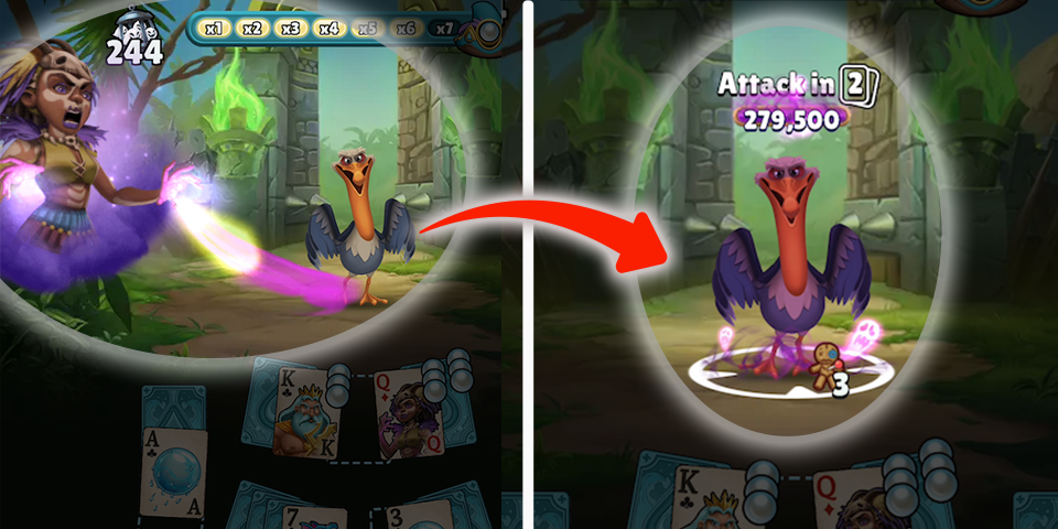 When a monster is Cursed, it turns purple. A Voodoo Doll icon and turn counter appear in front of it, showing how many cards you can draw before the effect ends. While Cursed, each Voodoo Doll card you play deals extra damage to the monster.