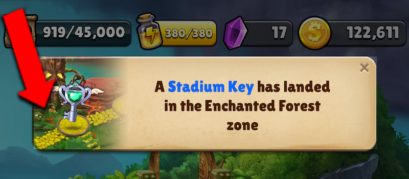 You can earn Stadium Keys by playing battles on the Map. When a battle offering a Mine Key appears, you’ll see a notification at the top of your screen.