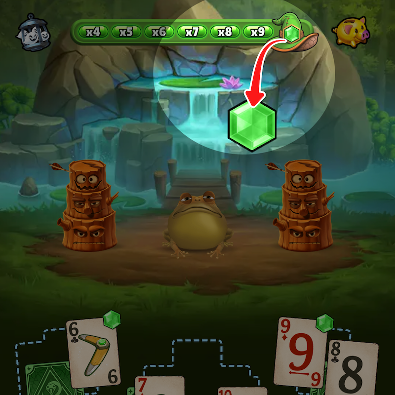 To complete the challenge that asks you to "Generate X Magic Emeralds", play 6 cards in a row to activate your Emerald Hat, then play as many cards as possible before drawing a new card.