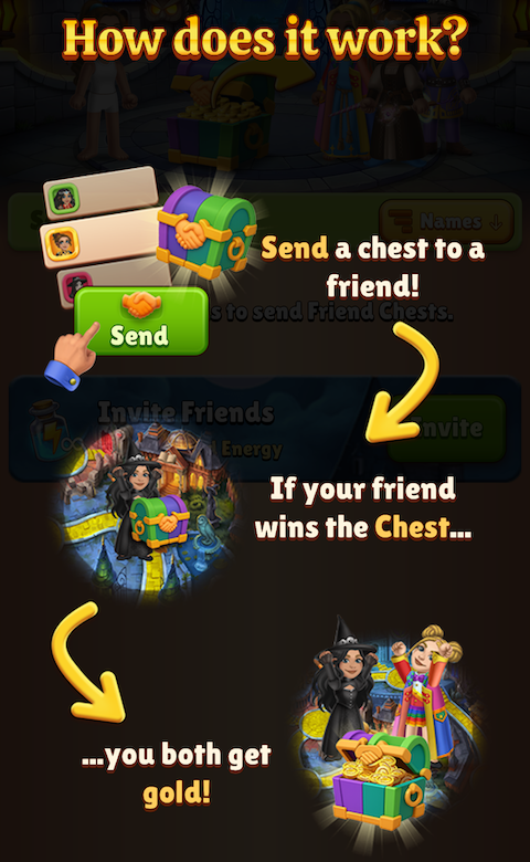 Exciting news in Sorcery School! You can now send a Friend Chest to a friend and have a chance to win Gold together by completing battles.
